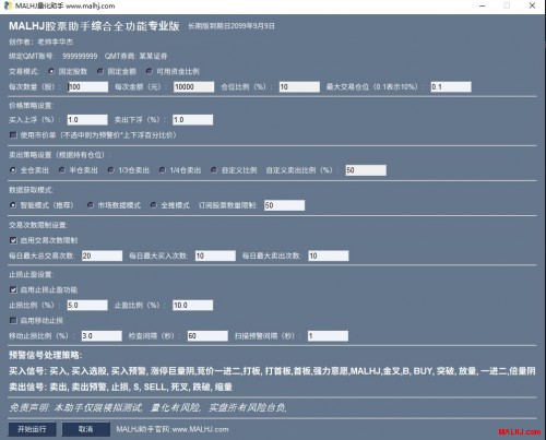 1.分三种交易模块,固定股数,固定金额,可用资金比例 2.买卖上下浮价格笼子委托 3.市价委托或限价委托 4.卖出策略分全仓,半仓,1/3仓,自定义比例 5.数据获取方式,智能模式。 6.风控模式交易限制 7.风控止损止赢 8.移动止损止赢模式 9.可设置移动止损止赢刷新时间秒 10.可设置预警扫描时间秒 11.买卖预警信号处理策略,只买卖相关的预警(与免费版有很大区别) 综合全功能专业版设置效果图:以最新版为准 图片:21.JPG 图2: 图片:22.JPG 此为通达信预警+QMT下单版MALHJ股票综合专业助手价格: 特别提醒:绑定QMT帐号+绑定券商,在使用期内不可更改。换绑另外重新购买,购买前请请认真阅读【风险揭示书】,选择即代表您完全认可协议的内容,量化有风险,投资需谨慎。 MALHJ量化自动交易助手年版:680元/年, 赠送MALHJ通用系列公式一份。 MALHJ量化自动交易助手五年版:1980元/5年 赠送MALHJ专业版系列公式一份加内部教学课程,功能详情:http://www.malhj.com/read-185.html MALHJ量化自动交易助手长期版:3680元长期可用 赠送MALHJ专业版系列公式一份加内部教学课程,功能详情:http://www.malhj.com/read-185.html 想更多了解MALHJ股指助手综合全功能专业版的粉丝可加 微信号:w1968131366(非诚勿扰,不喜勿加) 手机微信同号:15907742318(非诚勿扰,不喜勿加) 。 或者扫码加好友